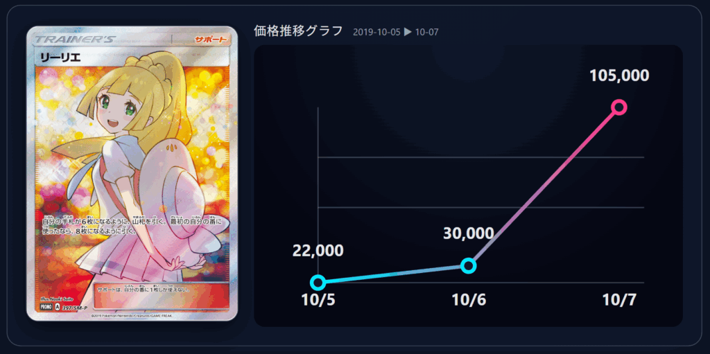 短期的な相場の下落はあるものの、プロモや販売終了したカードは高い確率で高騰し続けています。